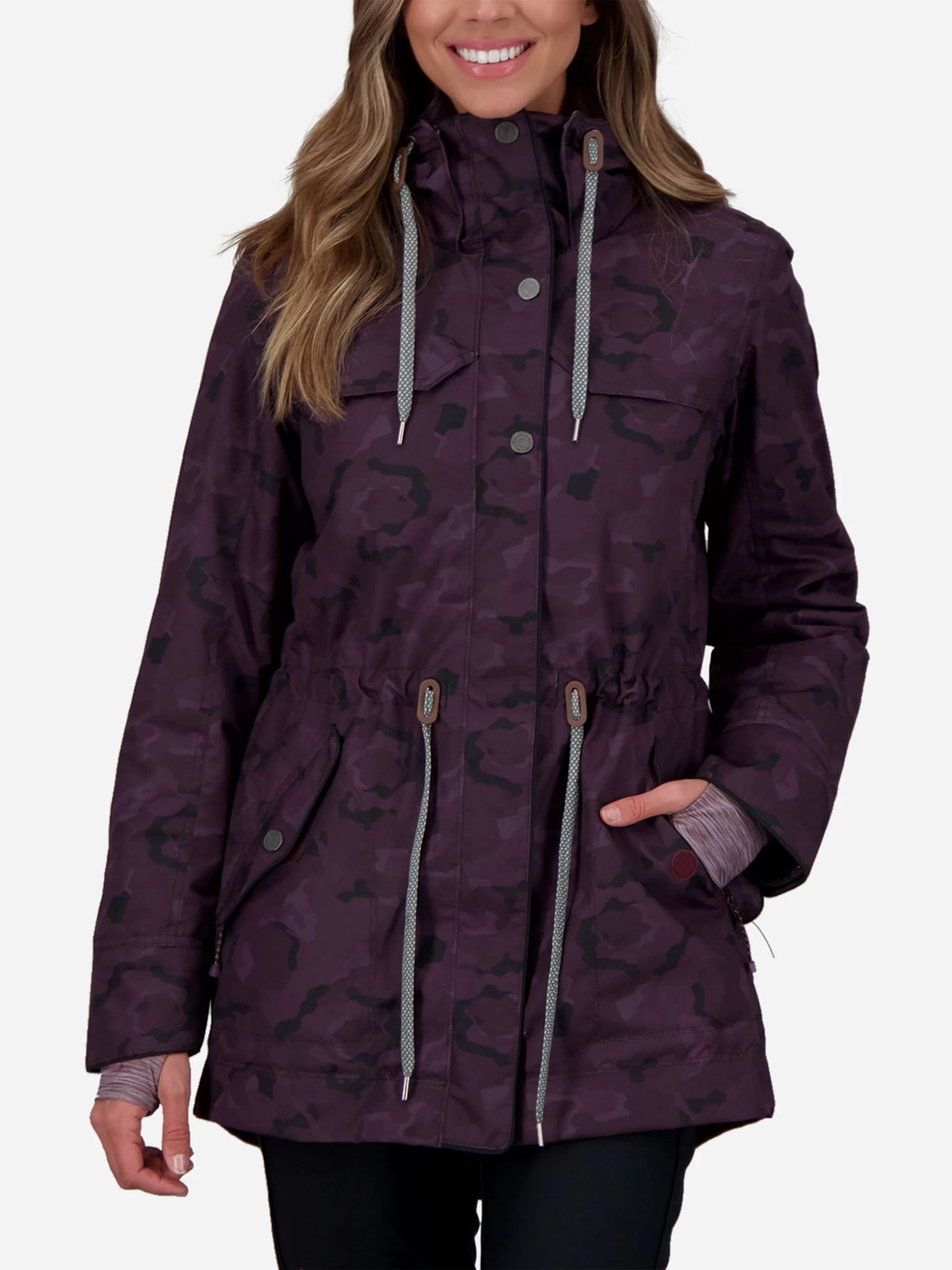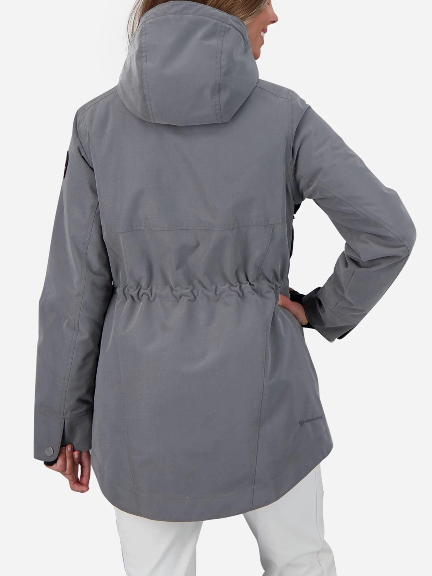 FEATURES:Down JacketAttached, 2-Way Adjustable Fleece-Lined Hood2-Way, Front YKK® Metaluxe® ZipperHigh Collar with Adjustable DrawstringsLong Sleeve with Adjustable Cuffs; Thumbhole Inner CuffsCZVâ„¢ – Control Zone VentilationDown: 100gm Body; 80gm Sleeve & CollarInterior Pass PocketDetachable Goggle ClothSnap-Awayâ„¢ Water-Resistant PowderskirtAdjustable WaistAccessory RingKey KeeperHigh Low HemHydroBlock® Sport 100% Polyester Twill Weave